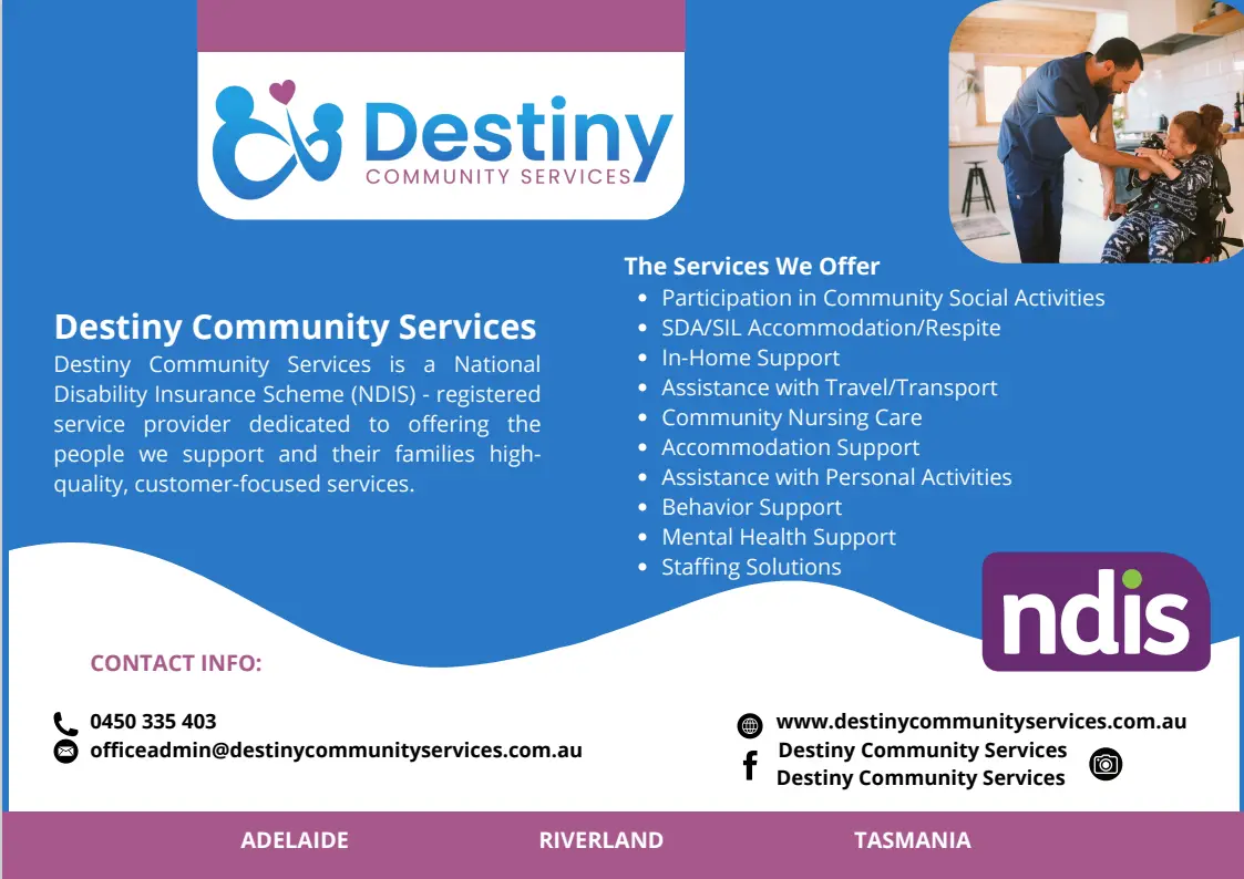 Destiny Community Services provides compassionate, personalized, and empowering NDIS services in Adelaide, Riverland and Tasmania Region, committed to transforming lives through the power of care.
